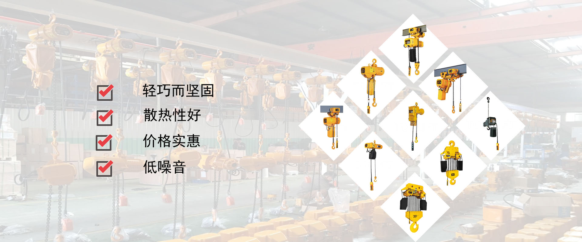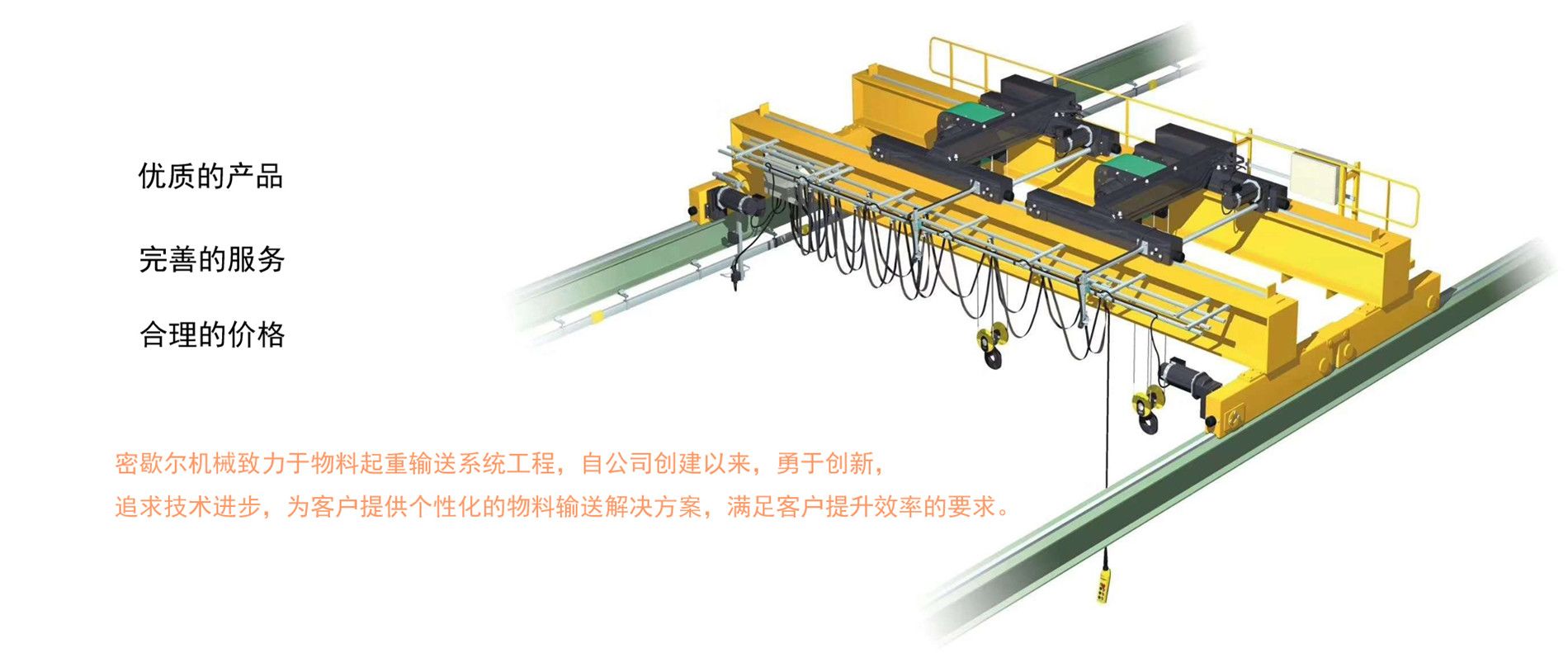 密歇爾起重機(jī)械(杭州)有限公司提供全面的起重輸送產(chǎn)品和服務(wù),產(chǎn)品覆蓋環(huán)鏈電動(dòng)葫蘆(125Kg-80T),歐式鋼絲繩葫蘆,防爆葫蘆,懸臂吊,KBK柔性起重機(jī),歐式起重機(jī),起重馬達(dá),端梁,起重移動(dòng)供電系統(tǒng)等,在國內(nèi)外被廣泛的應(yīng)用于生產(chǎn)車間,汽車,模具,機(jī)械制造,鐵路,船舶,物流搬運(yùn),現(xiàn)代化工廠流水線等工業(yè)及其它特殊用途。